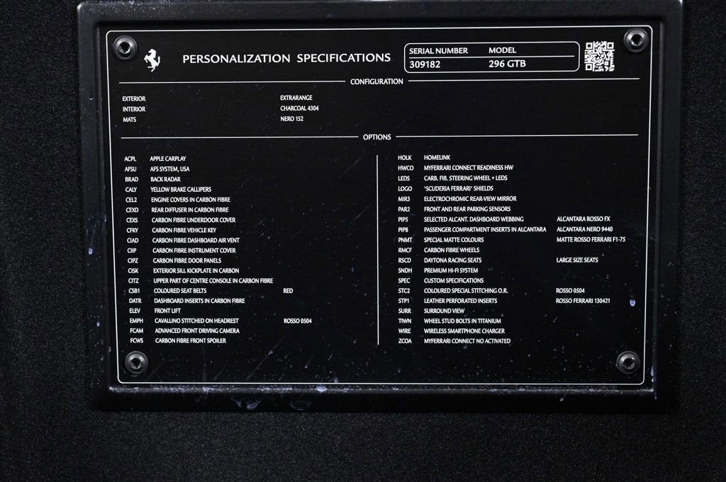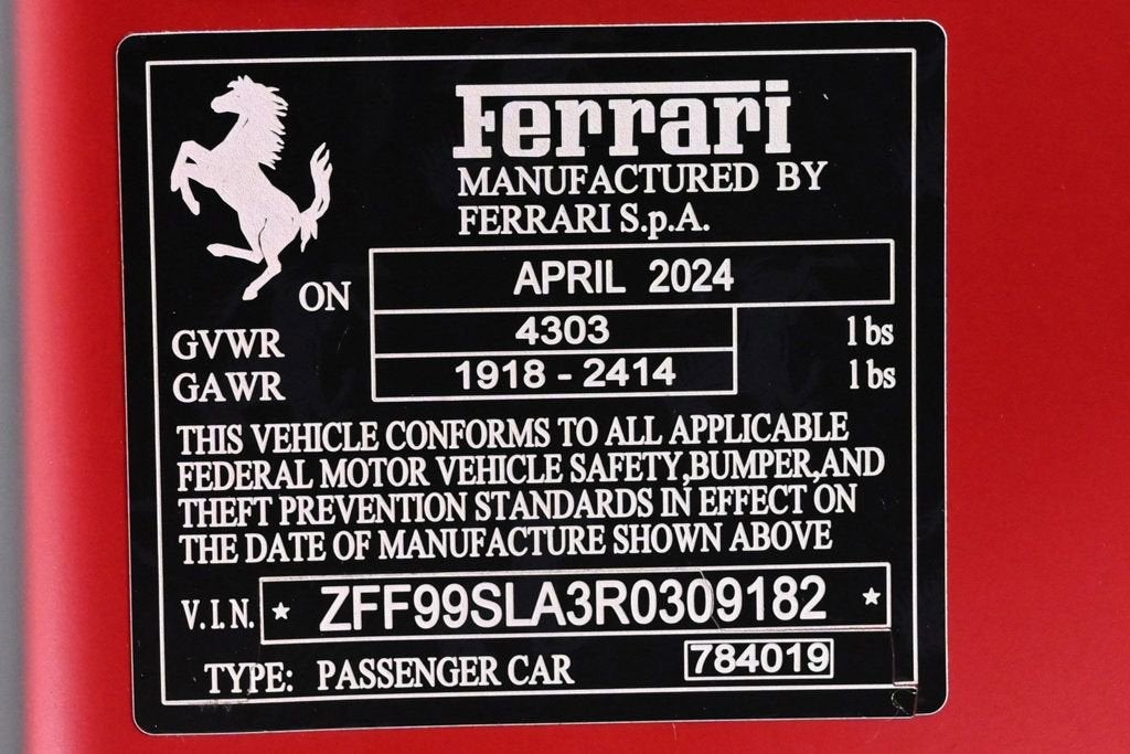 EXTREMELY LOW MILES! Get the best value from your vehicle purchase. This 2024 boasts an extremely low 1840 miles! KEY FEATURES AND OPTIONS Comes equipped with: Air Conditioning, Navigation System. This Ferrari 296 GTB also includes Clock, Climate Control, Power Passenger Seat, Tachometer, Memory Seat Position, Digital Info Center, Cruise Control, Tilt Steering Wheel, Power Steering, Telescoping Steering Wheel, Power Windows, Steering Radio Controls, Power Mirrors, Leather Steering Wheel, Leather Shifter, Driver Airbag, ABS Brakes, Fog Lights, Passenger Airbag, Traction Control, Intermittent Wipers, Side Airbags, Dynamic Stability, Keyless Entry, Rear Defogger, Security System, AM/FM, Satellite Radio, Rear Spoiler, Center Arm Rest, Cup Holders, Remote Fuel Door, Remote Trunk Lid, Heated Mirrors, Rear Fog Lamps, Daytime Running Lights, Parking Sensors, Reverse Camera, Roll Stability Control, Adaptive headlights, Tire Pressure Monitor, Premium Sound, Carpeted Floor Mats, HD Radio, Onboard Hard Drive, Voice Control. Located on the corner of Biscayne and 16th Street. - This 2024 Ferrari 296 GTB 2dr Base features a 3.0L V6 DOHC 24V 6cyl engine. It is equipped with a 8 Speed Automatic transmission. The vehicle is Red with a Other Leather interior. It is offered As-Is, extended warranty is available.