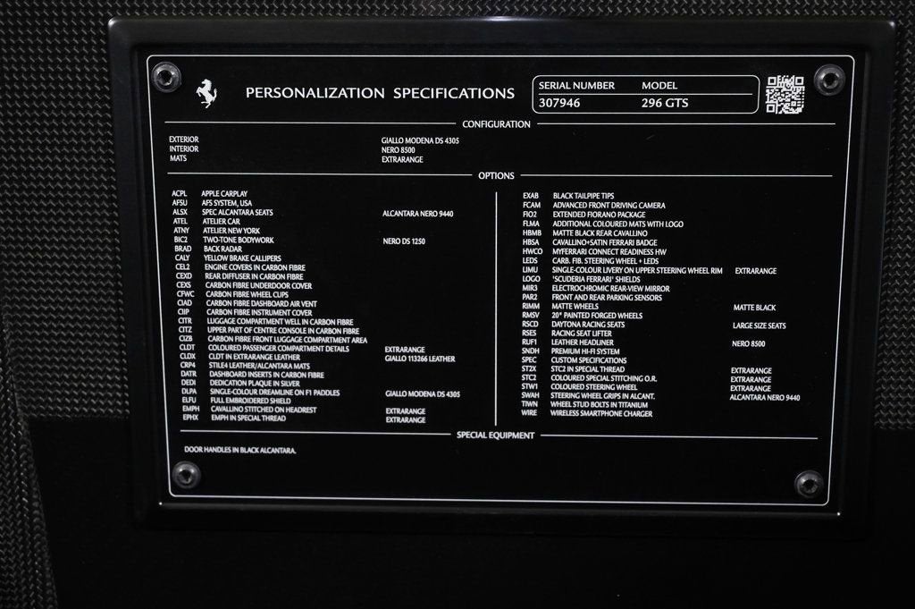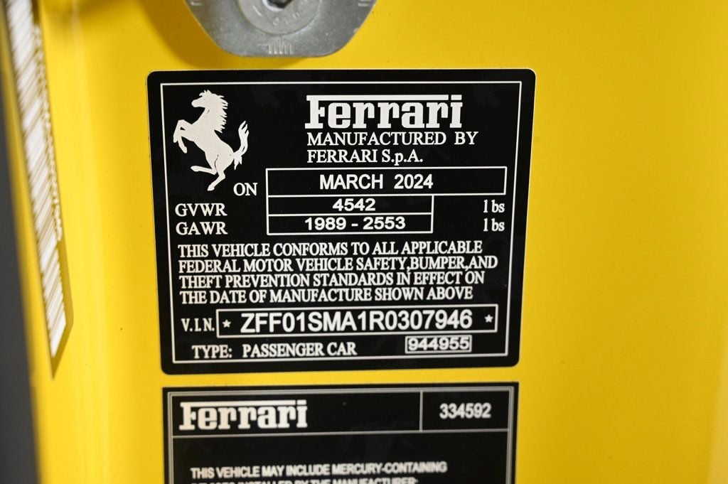 VERY LOW MILES! At just 47 miles, this 2024 Ferrari provides great value. KEY FEATURES AND OPTIONS Comes equipped with: Air Conditioning, Navigation System. This Ferrari 296 GTS also includes Clock, Climate Control, Power Passenger Seat, Tachometer, Memory Seat Position, Digital Info Center, Cruise Control, Tilt Steering Wheel, Power Steering, Telescoping Steering Wheel, Power Windows, Steering Radio Controls, Power Mirrors, Leather Steering Wheel, Leather Shifter, Driver Airbag, ABS Brakes, Fog Lights, Passenger Airbag, Traction Control, Intermittent Wipers, Side Airbags, Dynamic Stability, Keyless Entry, Rear Defogger, Security System, AM/FM, Satellite Radio, Rear Spoiler, Center Arm Rest, Cup Holders, Remote Fuel Door, Remote Trunk Lid, Heated Mirrors, Rear Fog Lamps, Daytime Running Lights, Parking Sensors, Reverse Camera, Roll Stability Control, Adaptive headlights, Tire Pressure Monitor, Premium Sound, Carpeted Floor Mats, HD Radio, Onboard Hard Drive, Voice Control. Located on the corner of Biscayne and 16th Street. - This 2024 Ferrari 296 GTS 2dr Convertible features a 3.0L V6 DOHC 24V 6cyl engine. It is equipped with a 8 Speed Automatic transmission. The vehicle is Giallo Modena with a Other Leather interior. It is offered As-Is, extended warranty is available.