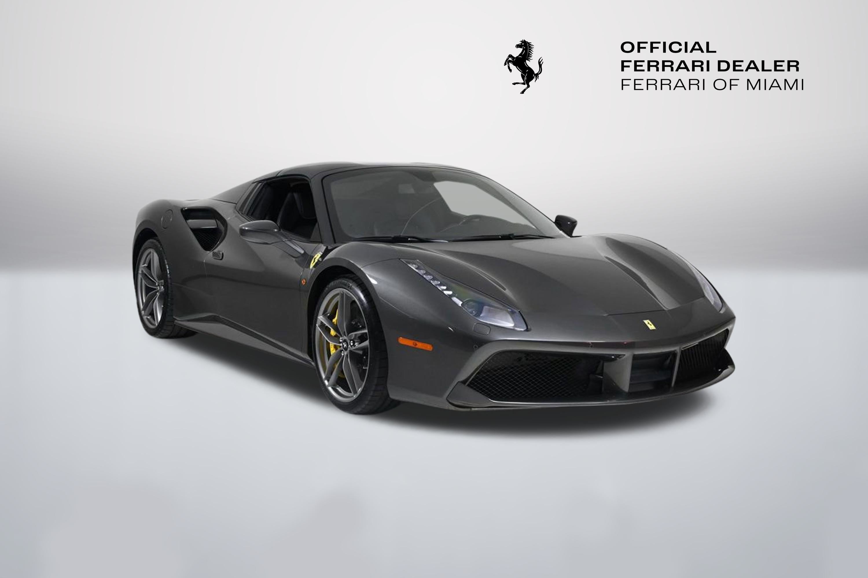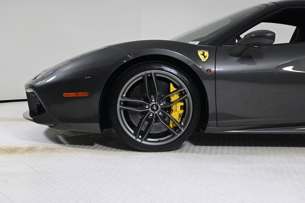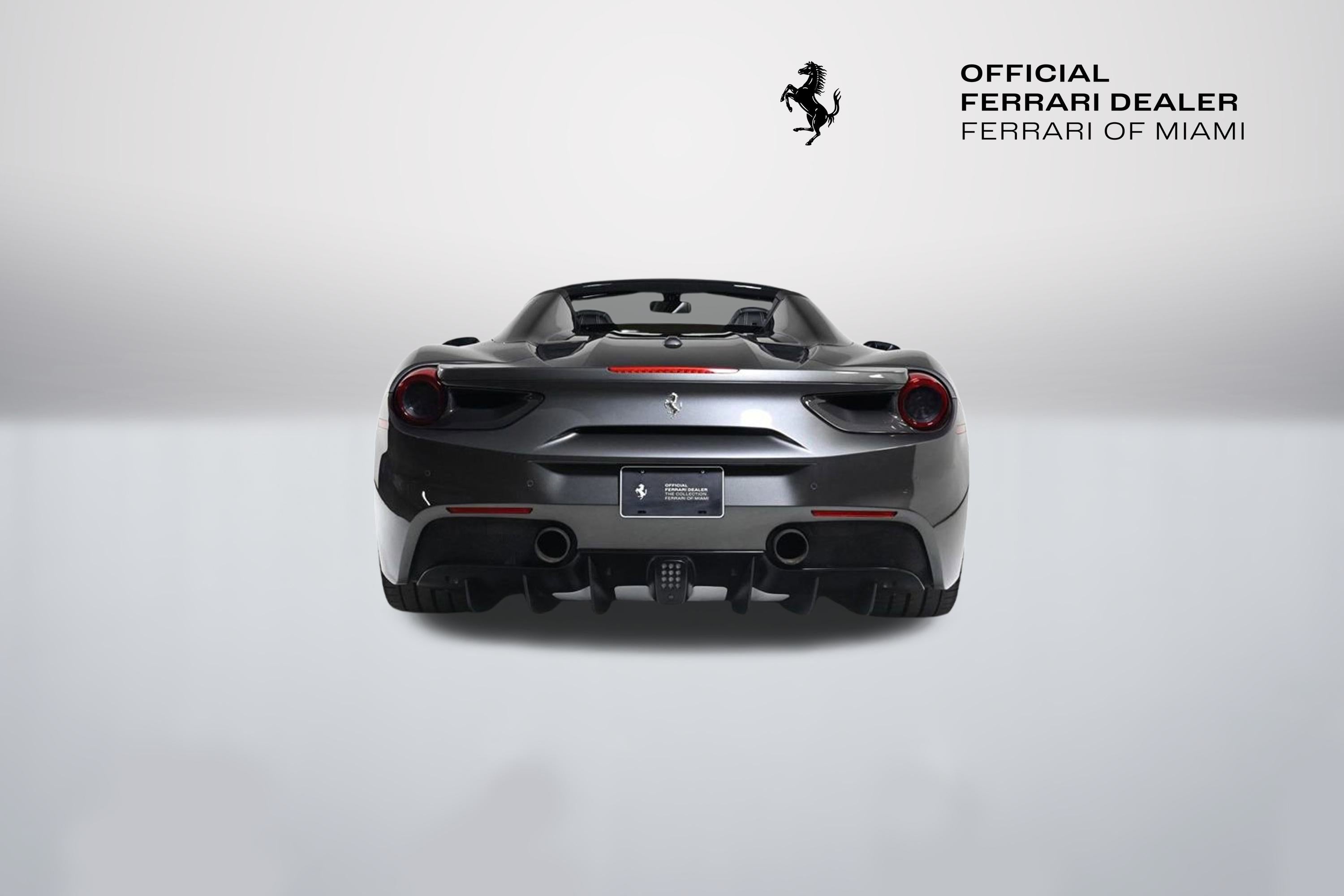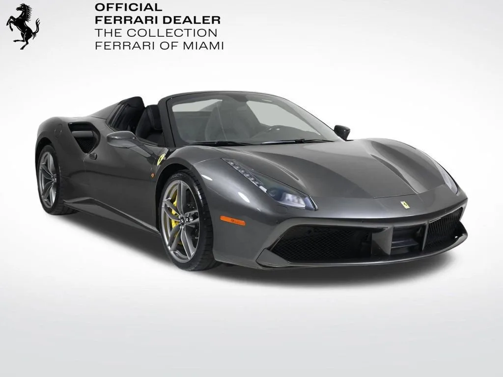 • - This 2019 Ferrari 488 Spider 2dr Convertible features a 3.9L V8 8cyl Gasoline engine. It is equipped with a 7 Speed Automatic transmission. The vehicle is Canna di Fucile with a Nero Leather interior. It is offered As-Is, extended warranty is available. - Air Conditioning, Climate Control, Dual Zone Climate Control, Cruise Control, Power Steering, Power Windows, Power Mirrors, Leather Steering Wheel, Leather Shifter, Memory Seat Position, Clock, Tachometer, Digital Info Center, Tilt Steering Wheel, Telescoping Steering Wheel, Steering Wheel Radio Controls, Driver Airbag, Passenger Airbag, Side Airbags, Keyless Entry, Security System, ABS Brakes, Traction Control, Dynamic Stability, Rear Defogger, Fog Lights, Intermittent Wipers, AM/FM, CD Player, CD Changer, Factory Premium Sound System, Alloy Wheels, Leather Interior Surface, Navigation System, Convertible HardTop, 6 Speakers, harman/kardon Speakers, Radio data system, Automatic temperature control, Adaptive suspension, Four wheel independent suspension, 4-Wheel Disc Brakes, Ceramic disc brakes: front and rear, Dual front impact airbags, Dual front side impact airbags, Front anti-roll bar, Integrated roll-over protection, Low tire pressure warning, Passenger cancellable airbag, Rear anti-roll bar, Brake assist, Exterior Parking Camera Rear, Rear Parking Sensors, Delay-off headlights, Fully automatic headlights, Headlight cleaning, Bumpers: body-color, Convertible roof wind blocker, Heated door mirrors, Power door mirrors, Spoiler, Apple CarPlay, Compass, Convertible roof lining, Driver door bin, Front reading lights, Illuminated entry, Outside temperature display, Power convertible roof, Sport steering wheel, Telescoping steering wheel, Voltmeter, Front Center Armrest, Leather Seat Trim, Sport Bucket Seats, Sport Plus Seats, Passenger door bin, Wheels: 20 x 9 Fr & 20 x 11 Rr Forged Matte Grey, Glass rear window, Rain sensing wipers Aux. Audio Input, Carpeted Floor Mats, Center Arm Rest, Cup Holders, Daytime Running Lights, Heated Mirrors, Navigation System, Parking Sensors, Rear Fog Lamps, Rear Spoiler, Rear Spoiler, Remote Fuel Door, Remote Trunk Lid, Reverse Camera, Roll Stability Control, Sport Seats, Tire Pressure Monitor -