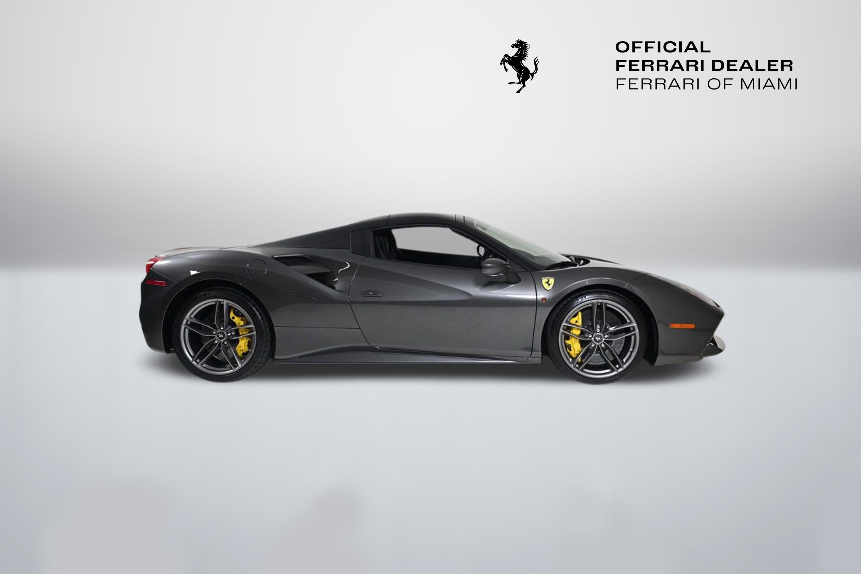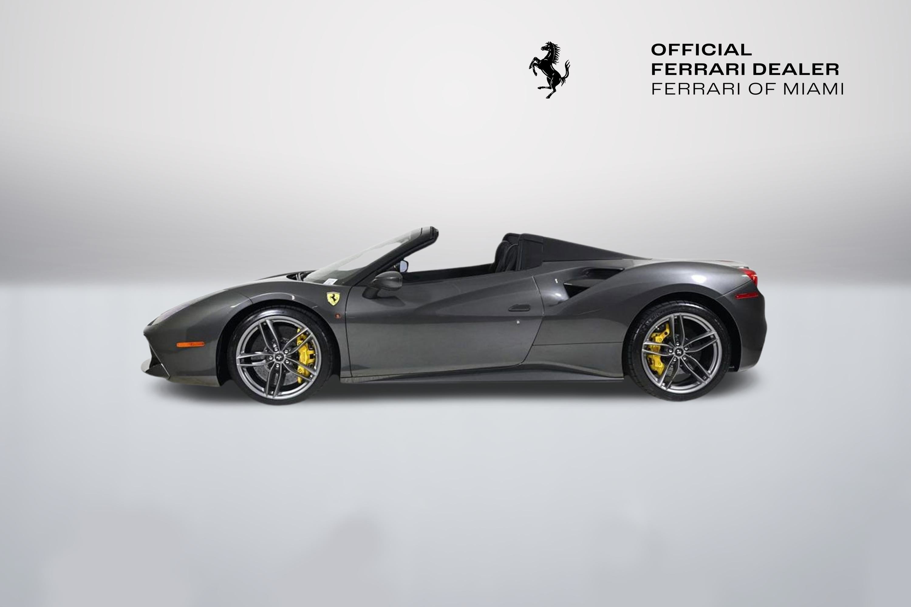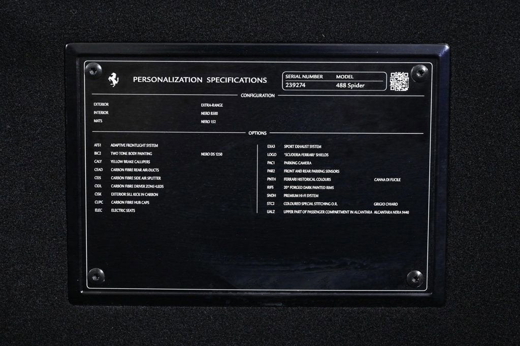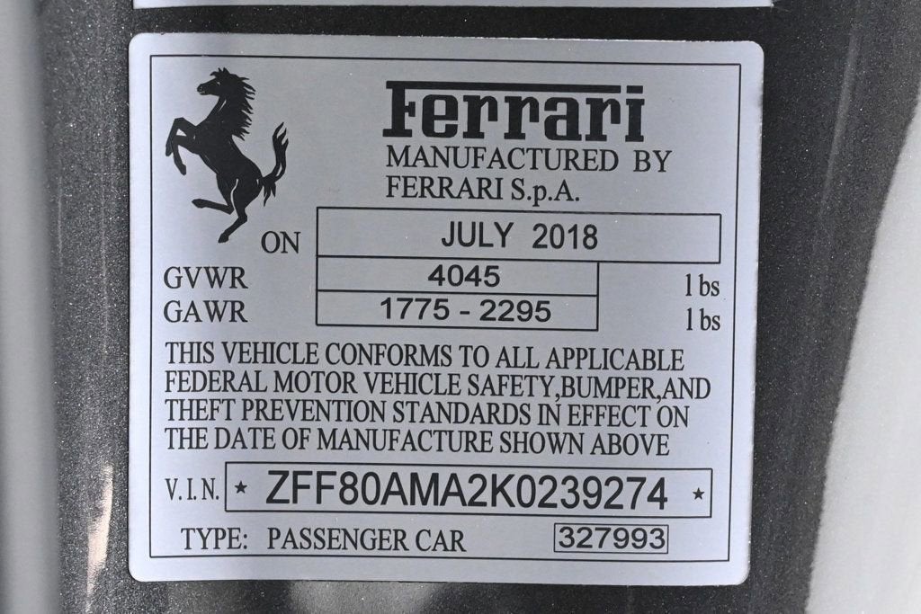 • - This 2019 Ferrari 488 Spider 2dr Convertible features a 3.9L V8 8cyl Gasoline engine. It is equipped with a 7 Speed Automatic transmission. The vehicle is Canna di Fucile with a Nero Leather interior. It is offered As-Is, extended warranty is available. - Air Conditioning, Climate Control, Dual Zone Climate Control, Cruise Control, Power Steering, Power Windows, Power Mirrors, Leather Steering Wheel, Leather Shifter, Memory Seat Position, Clock, Tachometer, Digital Info Center, Tilt Steering Wheel, Telescoping Steering Wheel, Steering Wheel Radio Controls, Driver Airbag, Passenger Airbag, Side Airbags, Keyless Entry, Security System, ABS Brakes, Traction Control, Dynamic Stability, Rear Defogger, Fog Lights, Intermittent Wipers, AM/FM, CD Player, CD Changer, Factory Premium Sound System, Alloy Wheels, Leather Interior Surface, Navigation System, Convertible HardTop, 6 Speakers, harman/kardon Speakers, Radio data system, Automatic temperature control, Adaptive suspension, Four wheel independent suspension, 4-Wheel Disc Brakes, Ceramic disc brakes: front and rear, Dual front impact airbags, Dual front side impact airbags, Front anti-roll bar, Integrated roll-over protection, Low tire pressure warning, Passenger cancellable airbag, Rear anti-roll bar, Brake assist, Exterior Parking Camera Rear, Rear Parking Sensors, Delay-off headlights, Fully automatic headlights, Headlight cleaning, Bumpers: body-color, Convertible roof wind blocker, Heated door mirrors, Power door mirrors, Spoiler, Apple CarPlay, Compass, Convertible roof lining, Driver door bin, Front reading lights, Illuminated entry, Outside temperature display, Power convertible roof, Sport steering wheel, Telescoping steering wheel, Voltmeter, Front Center Armrest, Leather Seat Trim, Sport Bucket Seats, Sport Plus Seats, Passenger door bin, Wheels: 20 x 9 Fr & 20 x 11 Rr Forged Matte Grey, Glass rear window, Rain sensing wipers Aux. Audio Input, Carpeted Floor Mats, Center Arm Rest, Cup Holders, Daytime Running Lights, Heated Mirrors, Navigation System, Parking Sensors, Rear Fog Lamps, Rear Spoiler, Rear Spoiler, Remote Fuel Door, Remote Trunk Lid, Reverse Camera, Roll Stability Control, Sport Seats, Tire Pressure Monitor -