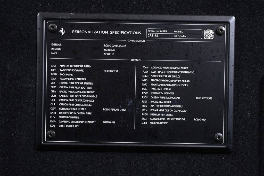 EXTREMELY LOW MILES! Get the best value from your vehicle purchase. This 2022 boasts an extremely low 17749 miles! KEY FEATURES AND OPTIONS Comes equipped with: Air Conditioning, Navigation System. This Ferrari F8 Spider also includes Clock, Climate Control, Tachometer, Multi-Zone Climate Control, Digital Info Center, Cruise Control, Tilt Steering Wheel, Power Steering, Telescoping Steering Wheel, Power Windows, Power Mirrors, Leather Steering Wheel, Leather Shifter, Driver Airbag, ABS Brakes, Fog Lights, Passenger Airbag, Traction Control, Intermittent Wipers, Side Airbags, Dynamic Stability, Keyless Entry, Rear Defogger, Security System, AM/FM, Rear Spoiler, Cup Holders, Remote Fuel Door, Remote Trunk Lid, Heated Mirrors, Rear Fog Lamps, Daytime Running Lights, Parking Sensors, Reverse Camera, Roll Stability Control, Tire Pressure Monitor, Premium Sound, HD Radio, Onboard Hard Drive, Voice Control. Air Conditioning, Climate Control, Dual Zone Climate Control, Cruise Control, Power Steering, Power Windows, Power Mirrors, Leather Steering Wheel, Leather Shifter, Clock, Tachometer, Digital Info Center, Tilt Steering Wheel, Telescoping Steering Wheel, Driver Airbag, Passenger Airbag, Side Airbags, Keyless Entry, Security System, ABS Brakes, Traction Control, Dynamic Stability, Rear Defogger, Fog Lights, Intermittent Wipers, AM/FM, Alloy Wheels, Leather Interior Surface, , Convertible HardTop, 6 Speakers, Radio data system, Automatic temperature control, Adaptive suspension, Four wheel independent suspension, 4-Wheel Disc Brakes, Ceramic disc brakes: front and rear, Dual front impact airbags, Dual front side impact airbags, Front anti-roll bar, Integrated roll-over protection, Low tire pressure warning, Passenger cancellable airbag, Rear anti-roll bar, Brake assist, Exterior Parking Camera Rear, Rear Parking Sensors, Delay-off headlights, Fully automatic headlights, Bumpers: body-color, Convertible roof wind blocker, Heated door mirrors, Power door mirrors, Spoiler, Apple CarPlay, Compass, Convertible roof lining, Driver door bin, Front reading lights, Illuminated entry, Outside temperature display, Power convertible roof, Sport steering wheel, Standard Seats, Telescoping steering wheel, Voltmeter, Leather Seat Trim, Sport Plus Seats, Passenger door bin, Wheels: 20 Standard, Glass rear window, Rain sensing wipers Cup Holders, Daytime Running Lights, Heated Mirrors, Navigation System, Parking Sensors, Premium Sound, Rear Fog Lamps, Rear Spoiler, Rear Spoiler, Remote Fuel Door, Remote Trunk Lid, Reverse Camera, Roll Stability Control, Tire Pressure Monitor - Contact THE COLLECTION GENERAL at 786-349-9658 or GENERAL@THECOLLECTION.COM for more information. -