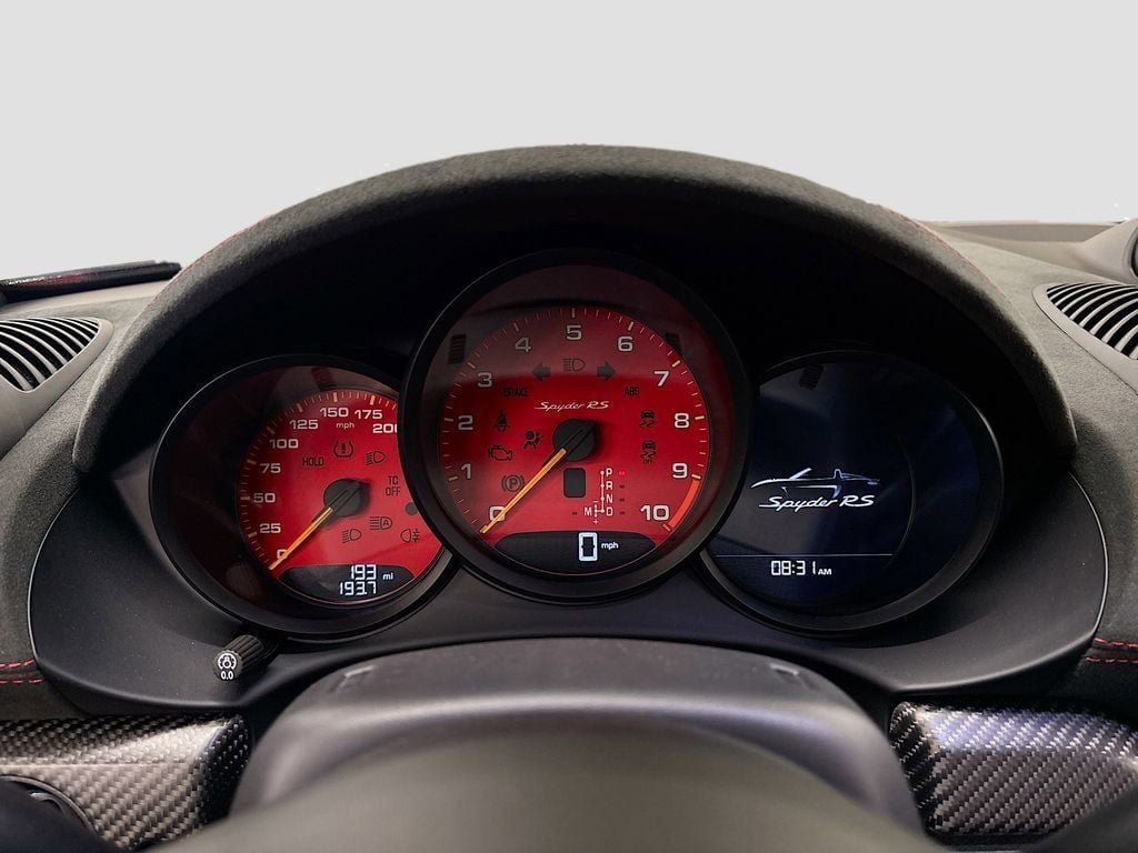 - Limited Warranty: 24 Month/Unlimited Mile beginning after new car warranty expires or from certified purchase date Air Conditioning, Climate Control, Dual Zone Climate Control, Cruise Control, Power Steering, Power Windows, Power Mirrors, Power Passenger Seat, Memory Seat Position, Phone, Clock, Tachometer, Digital Info Center, Homelink System, Tilt Steering Wheel, Telescoping Steering Wheel, Driver Airbag, Passenger Airbag, Side Airbags, Keyless Entry, Security System, ABS Brakes, Traction Control, Dynamic Stability, Rear Defogger, Intermittent Wipers, AM/FM, Alloy Wheels, Leather Interior Surface, , Chrono Package, Light Design Package, Smoking Package, Sound Package Plus with 6 Loudspeakers, Weissach Package, 6 Speakers, Radio data system, Automatic temperature control, Porsche Communication Management, Power driver seat, Voice Control, Adaptive suspension, Four wheel independent suspension, 4-Wheel Disc Brakes, Dual front impact airbags, Dual front side impact airbags, Front anti-roll bar, Integrated roll-over protection, Knee airbag, Low tire pressure warning, Occupant sensing airbag, Overhead airbag, Porsche Ceramic Composite Brake, Rear anti-roll bar, Seat Belts in Guards Red, Brake assist, Exterior Parking Camera Rear, Delay-off headlights, Fully automatic headlights, High intensity discharge headlights: Bi-Xenon, Bumpers: body-color, Convertible roof wind blocker, Front Trunk Lid in Exposed Carbon Fiber, Heated door mirrors, LED Headlights with Porsche Dynamic Light System, Power door mirrors, Spoiler, Spyder RS Top with Accents in Deviated Color, Chrono Stopwatch Dial in Guards Red, Convertible roof lining, Door Pull Loops in Guards Red, Driver door bin, Driver vanity mirror, Fire Extinguisher, Front reading lights, Full Bucket Seats, Illuminated entry, Instrument Dials in Guards Red, Outside temperature display, Passenger vanity mirror, Sport steering wheel, Telescoping steering wheel, Front Center Armrest, Sport Plus Seats, Two-Tone Leather/Race-Tex Seat Trim, Passenger door bin, Wheels: 20 718 Cayman GT4 RS Forged Aluminum, Glass rear window, Recent Oil Change, Passed Inspection, ONLY 186 MILES / 1 OWNER / AS NEW, FRESHLY INSPECTED & SERVICED @ THE COLLECTION PORSCHE., NICELY EQUIPPED WITH MANY PORSCHE FACTORY ORDERED OPTIONS., INCLUDES 1ST & 2ND YEAR PREPAID PORSCHE SERVICE Carpeted Floor Mats, Center Arm Rest, Cup Holders, Daytime Running Lights, Heated Mirrors, HID Headlamps, Navigation System, Parking Sensors, Premium Sound, Rear Spoiler, Rear Spoiler, Reverse Camera, Roll Stability Control, Side Curtain Airbags, Tire Pressure Monitor, Vanity Mirrors - Contact Alvaro Uribe at 786-628-7606 or auribe@ferrariofmiami.com for more information. -