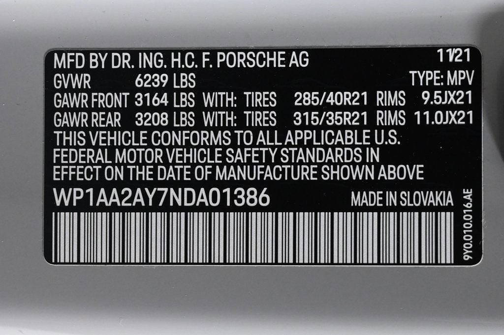 VERY LOW MILES! At just 26595 miles, this 2022 Porsche provides great value. LOADED WITH VALUE! Comes equipped with: Air Conditioning, Navigation System, Front Heated Seats. This Porsche Cayenne also includes Power Driver's Seat, Clock, Climate Control, Power Passenger Seat, Tachometer, Multi-Zone Climate Control, Digital Info Center, Cruise Control, Homelink System, Privacy Glass/Tinted Windows, Tilt Steering Wheel, Power Steering, Telescoping Steering Wheel, Power Windows, Steering Radio Controls, Power Mirrors, Leather Steering Wheel, Leather Shifter, Driver Airbag, ABS Brakes, Fog Lights, Passenger Airbag, Traction Control, Intermittent Wipers, Dynamic Stability, Keyless Entry, Rear Defogger, Security System, AM/FM, Satellite Radio, Sliding Rear Window, Rear Spoiler, Rear Wipers, Center Arm Rest, Remote Fuel Door, Vanity Mirrors, Heated Mirrors, Rear Fog Lamps, Child Proof Door Locks, Daytime Running Lights, Parking Sensors, Reverse Camera, Side Curtain Airbags, Roll Stability Control, Rear-Side Airbags, PCM, Power Lift Gate, Tire Pressure Monitor, Carpeted Floor Mats, Overhead Console, Aux. Audio Input, HD Radio, Onboard Hard Drive. Air Conditioning, Climate Control, Dual Zone Climate Control, Cruise Control, Tinted Windows, Power Steering, Power Windows, Power Mirrors, Leather Steering Wheel, Leather Shifter, Power Drivers Seat, Power Passenger Seat, Memory Seat Position, Phone, Clock, Tachometer, Digital Info Center, Homelink System, Tilt Steering Wheel, Telescoping Steering Wheel, Steering Wheel Radio Controls, Driver Airbag, Passenger Airbag, Keyless Entry, Security System, ABS Brakes, Traction Control, Dynamic Stability, Rear Defogger, Fog Lights, Intermittent Wipers, AM/FM, Alloy Wheels, Leather Interior Surface, , Premium Package Plus, 10 Speakers, Radio data system, Automatic temperature control, Comfort Access, Heated Front & Rear Seats, Porsche Communication Management, Power driver seat, Adaptive suspension, Four wheel independent suspension, 4-Wheel Disc Brakes, Dual front impact airbags, Dual front side impact airbags, Front anti-roll bar, Knee airbag, Low tire pressure warning, Occupant sensing airbag, Overhead airbag, Rear anti-roll bar, Rear side impact airbag, Panoramic Roof System, Power Liftgate, Brake assist, Exterior Parking Camera Rear, Delay-off headlights, Fully automatic headlights, Automatically Dimming Mirrors, Bumpers: body-color, Heated door mirrors, LED-Matrix Headlights with PDLS+, Porsche Logo & Model Designation in Satin Black, Power door mirrors, Spoiler, Turn signal indicator mirrors, Window Trim in High-Gloss Black, Ambient Lighting, Apple CarPlay, Driver door bin, Driver vanity mirror, Front reading lights, Illuminated entry, Lane Change Assist (LCA), Outside temperature display, Overhead console, Passenger vanity mirror, Rear reading lights, Rear seat center armrest, Surround View, Telescoping steering wheel, Voltmeter, Front Center Armrest, Front Seat Ventilation, Leather Seat Trim, Split folding rear seat, Sport Plus Seats, Passenger door bin, Wheels: 21 RS Spyder Design, Power Sunblinds for Rear Side Windows, Rain sensing wipers, Rear window wiper, Axle Ratio: 3.480, Recent Oil Change, Passed Inspection, 360 Camera, Adaptive Headlights, AndroidTM Auto/Apple Carplay, Automatic Headlights, Backup Camera, Blind-Spot Monitors, Bluetooth, Heated/Cooled Seats, Navigation, Touchscreen Controls, Voice Recognition, Wi-Fi Hotspot, 1 OWNER / SOLD NEW AND FULLY SERVICED @ THE COLLECTION PORSCHE, NICELY EQUIPPED WITH MANY PORSCHE FACTORY ORDERED OPTIONS., FULLY INSPECTED & FRESHLY SERVICED @ THE COLLECTION PORSCHE, PORSCHE FACTORY CERTIFIED PREOWNED CERTIFIED VEHICLE WARRANTY APPLIES. Adaptive headlights, Aux. Audio Input, Bluetooth, Carpeted Floor Mats, Center Arm Rest, Child Proof Door Locks, Daytime Running Lights, Front Heated Seats, Heated Mirrors, Navigation System, Overhead Console, Parking Sensors, PCM, Power Lift Gate, Rear Fog Lamps, Rear Spoiler, Rear Spoiler, Rear Wipers, Rear-Side Airbags, Remote Fuel Door, Reverse Camera, Roll Stability Control, Side Curtain Airbags, Sliding Rear Window, Tire Pressure Monitor, Vanity Mirrors - Contact Alvaro Uribe at 786-628-7606 or auribe@ferrariofmiami.com for more information. -