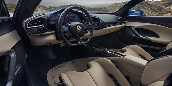 It only takes a moment's notice to activate the retractable hard top to close the cockpit of the 296 GTS to the outside world. The pure, minimalist interior design of the 296 GTS mirrors the elegant, yet powerful exterior aesthetic. The completely digital interface is ergonomically designed to facilitate driver commands.  When the engine is off, the onboard instruments go black, enhancing the pure look of the cabin. The unimposing passenger-side display allows the passenger to live the driving experience as a participant, almost a co-driver.